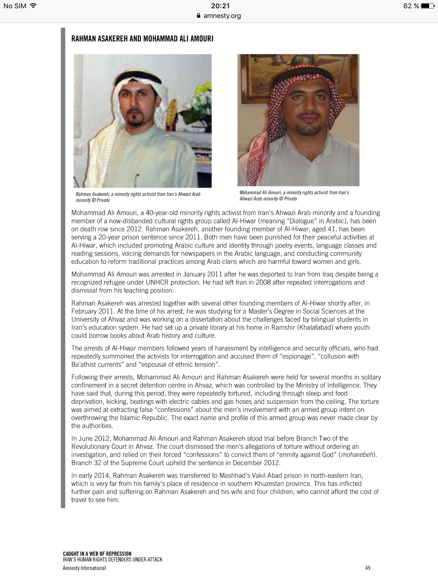 أثارت منظمة العفو الدولية، في تقرير شامل أصدرته في 2 أب/أغسطس2017 بعنوان: “ضحايا في شراك القمع: المدافعون عن حقوق الإنسان في إيران تحت نير الهجمات”، قضية اثنين من أبرز الناشطين العرب الأهوازيين، وهما #محمد_علي_العموري و #رحمان_عساكرة، اللذان يقضيان حكماً بالسجن المؤبد بسبب تأسيسهما مؤسسة “#الحوار” الثقافية في إقليم #الأهواز.